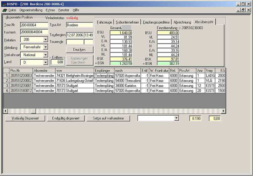 Darstellung des Brutto-Speditions-Nutzens pro Sendung, Bordero, Frachtkarte.