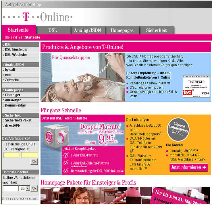 Testsieger 05/2006 Telefonieren und mit 6.000 surfen für monatlich € 34,99 mit der Telefon-Flatrate ! Klicken Sie hier oder unten auf die Anzeige und informieren Sie sich weiter. |