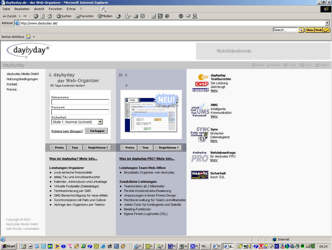 | WEB-Terminplaner "Zugang mit jedem INTERNET-PC"Neu - jetzt auch DAYBYDAYPRO, der WEB-Terminplaner für GruppenplanungWenn Sie einen eigenen Terminkalender einrichten möchten, klicken Sie unten den WEB-Terminplaner an. Dort können Sie sich "registrieren". Die Nutzung ist sehr kostengünstig. Die Netzwerkversion nennt sich "DaybydayPro" und kann zusätzlich freie Termine in bis zu mehreren 100 Clients suchen und/oder Einladungen versenden, die angenommen oder abgelehnt werden können. Zwischenzeitlich gibt es viele WEB-Terminplaner, aber keine, die Sie mit anderen teilen oder der Sie an Termine per SMS oder eMail erinnern kann. D.h., Sie können entweder einen GAST- oder Vollzugang anderen einräumen, die dann Ihren Kalender einsehen oder gar Einträge machen können. Soweit Sie kein Handy haben, kann die Terminerinnerung auch per eMail automatisch erfolgen. Der "Daybyday-WEB-Kalender" kann das alles. Geben Sie als "daybyday-Name" am besten Ihren Nach- oder Firmennamen an, da dieser Name dann auch für die eMails als Absender-eMail genutzt wird (Nachname@daybyday.de). In der Netzwerkversion wird der Clientname zudem vor den Firmennamen gesetzt. Im Anschluss werden Sie nach Ihrer eMail gefragt, an die Sie eine Anmeldebestätigung erhalten. Auf der nächsten Anmeldeseite werden Ihre Registrierungsdaten aufgezeigt, die am besten ausgedruckt werden. Anschließend können Sie den WEB-TERMINKALENDER sofort nutzen, nachdem Sie einige Grunddaten eingegeben haben. Viel Spass dabei ! P.S.: Outlookadressen und Termine können automatisch importiert werden. SMS, Faxe, Anrufbeantworter u.v.m. stehen zur Verfügung.